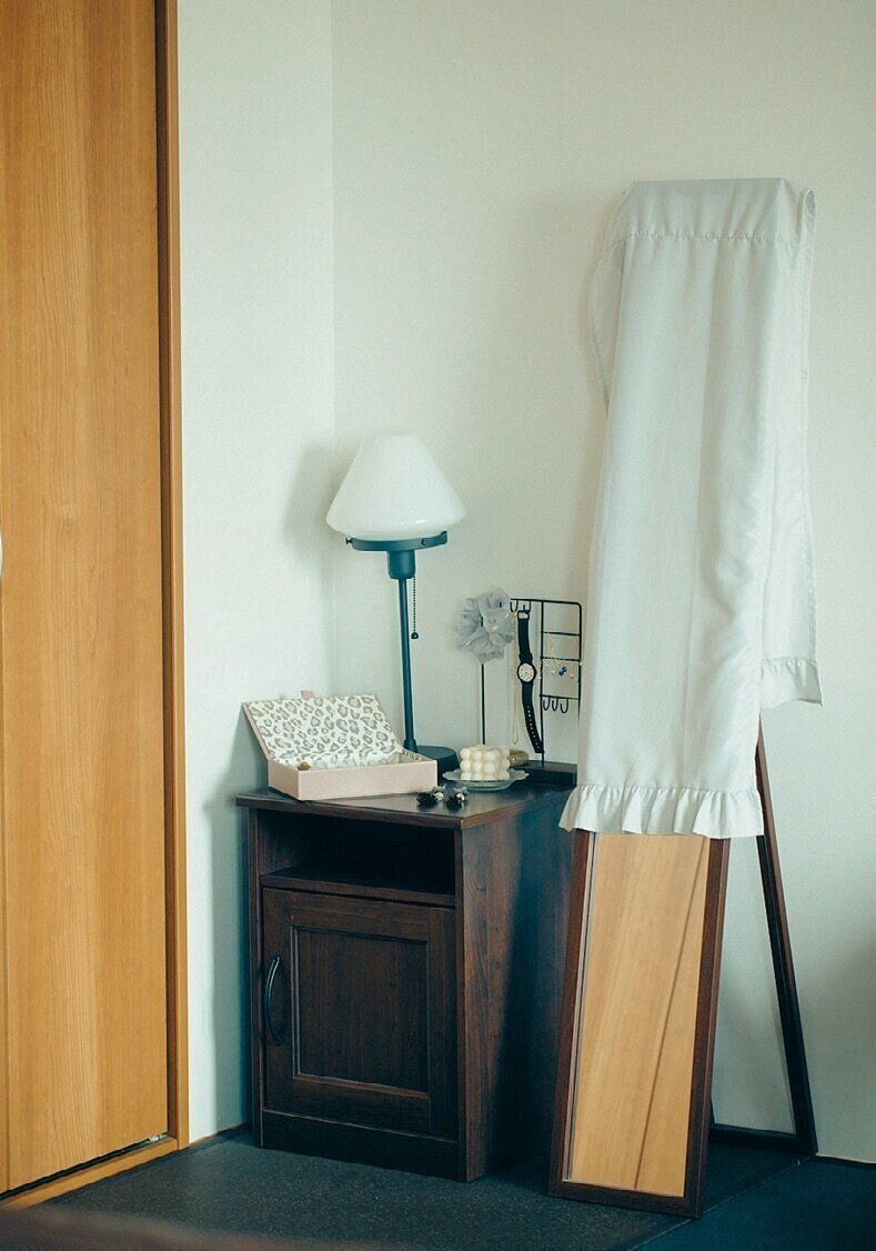 買う基準は"安いから"ではなく"欲しい物"。「姿見のカバーは実は100均のカフェカーテン。理想的な色だったので、自分でリメイクしました」。