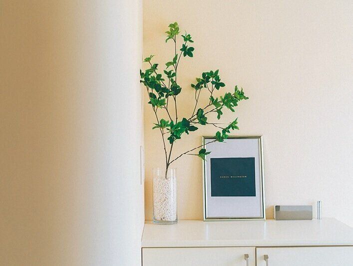 家に飾るのは、季節感を楽しめるグリーン。「もちろん生花は素敵だけど、りっぱな物は高価だし、定期的に水を替えたり取り換えるのが大変。手間をかけずに状態がいい、フェイクグリーンに決めました」。