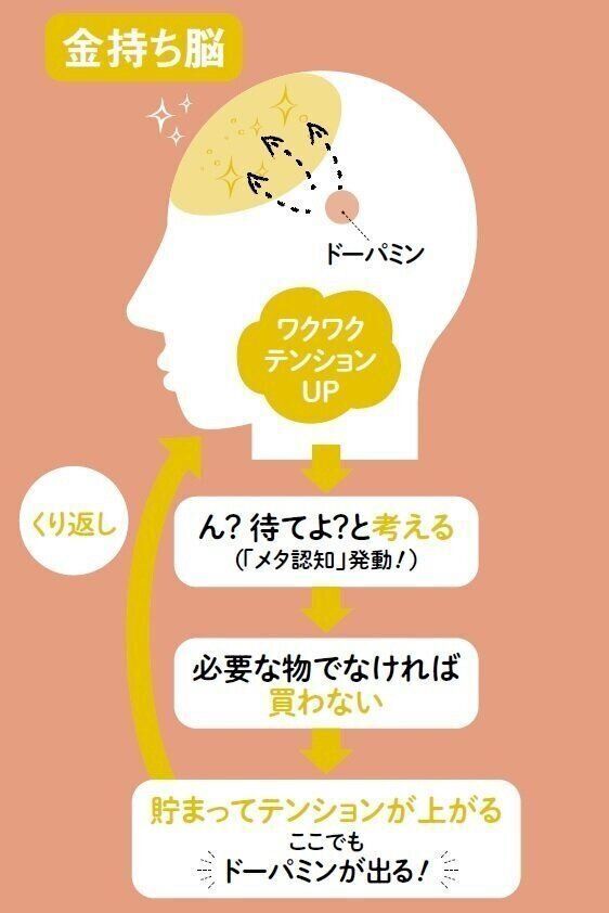 衝動買いに走りそうになった自分を、冷静に分析できるのが金持ち脳。「第三者の視点で自分を見る能力をメタ認知といいます。メタ認知力があると、客観的な判断ができるのでムダな出費が減。本当に気に入って買った物を使うときや、逆に買わずにお金を節約できたときも達成感でドーパミンが出るので、どんどん買い物上手になります」。