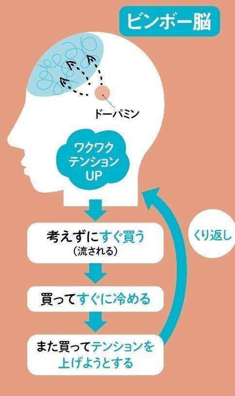 ビンボー脳は考える力が弱いため、ドーパミンに踊らされて衝動買いしがち。「ところがドーパミンはすぐ消えるので、買ったときの興奮や満足感が持続しません。"なぜこんな物を"と後悔しても、脳はドーパミンが大好きなので、また次の快感を求めて買ってしまう。結果としてムダな出費がくり返し続くのです」。