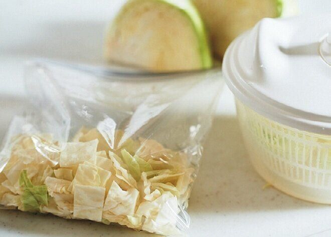 産直の野菜は安くて新鮮♪キャベツなどの葉物は使いやすいざく切りにして冷凍保存。冷蔵する分は、繰り返し使える野菜専用保存袋に入れて日持ちさせ、大事に使い切ります。