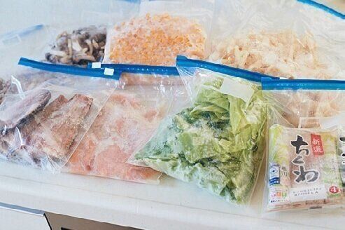 買った食材をそのまま冷蔵室に入れると、すぐパンパンになって存在を忘れがち。冷凍しても味が落ちない野菜、毎日使う食材はカットし、同じサイズの保存袋で冷凍保存すれば食材ロスを防止できます。