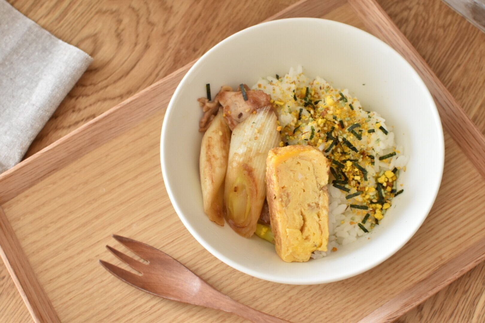 夫や子どものお弁当の残りを食べることもありますが、基本はご飯におかずを乗せた「なんでも丼」スタイルです。