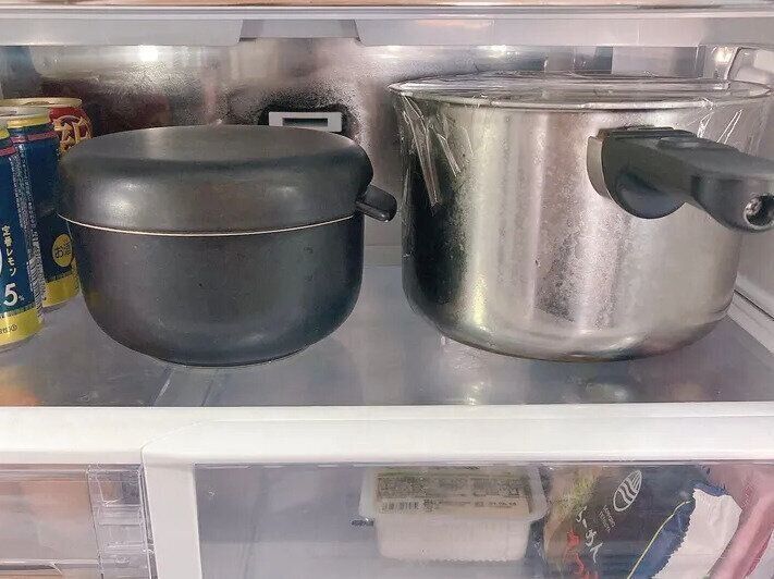 整理収納アドバイザーでサンキュ!STYLEライターの結さんにとっても、冷蔵庫の整理が食費節約の大きなポイント。こちらの写真は結さんの冷蔵庫。大きなお鍋が2つも入っていて驚きですよね。冷蔵庫整理のコツは、いつも定位置にフリースペースをつくっておくこと。急ないただきものや、明日の朝も食べたい残ったお味噌汁など、スペースがないと無理やりつっこむことになり、その奥に食品が隠れてしまうことに。「この場所は必ずあけておく」と決めてフリースペースをつくっておきましょう。