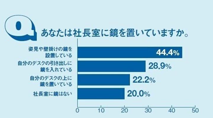中小企業の社長を対象にさまざまな調査をしている団体「社長チップス」によると、"8割の社長が、社長室に鏡を置いている"そう。日々、多くの仕事を担う社長たちは、自分の身だしなみにも気をつかっていることがわかりました。