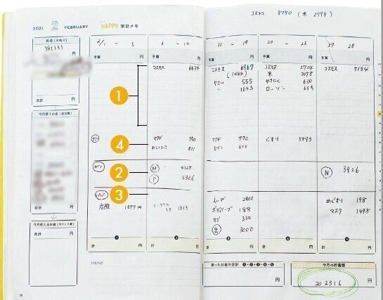 店名と使った金額をメモ。「買い物はなるべくまとめ買いにし、書く手間も最小限に」。