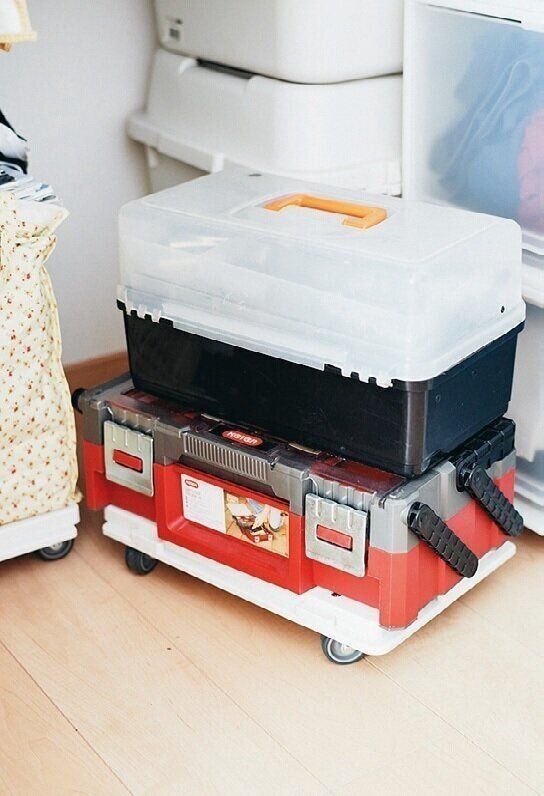 重い物はすべて無印の台車の上に。「ローラーがスムーズに動き、掃除や片づけが超ラク!体力温存のために、買いそろえました」。