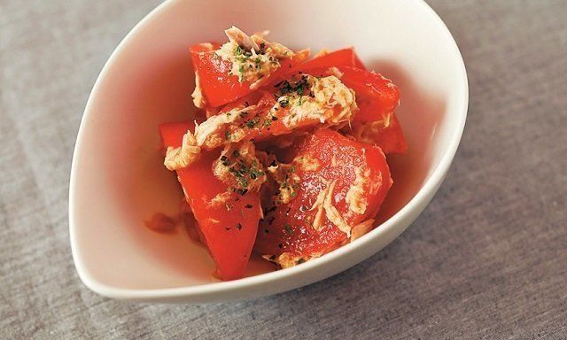 くし形に切ったトマトとツナをあえるだけ。味つけはツナ缶のオイル少々としょうゆのみ。トマトの皮もむかず、火も使わないからラク!