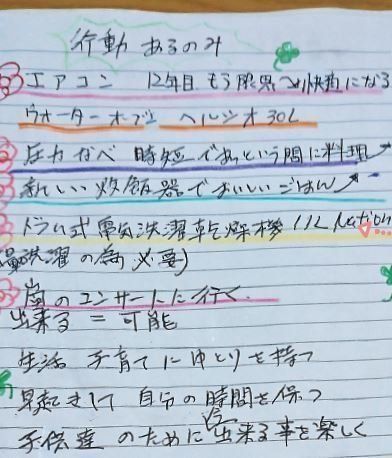 旅行は、行きたい日程や何をするかも一緒に書いてイメージを具体化。コストまで見える化すると、実現度が上がります。旅行なら「行く」、欲しい物なら「買う」と、言い切る語尾で書いているので、眺めるだけで、必ずかなう!という気持ちになりますよ。子どもたちにも宣言することで、ふだんのレジャーは安くても協力的に♪