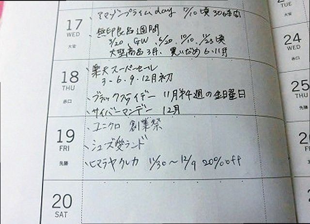 楽天、アマゾン、無印良品など、よく買うお店のセール情報や送料無料期間をメモ。「何月にどこが安くなるか」をすぐ確認できるから必要な物を底値でゲットできます。貯蓄に回せるお金がぐんとUP!