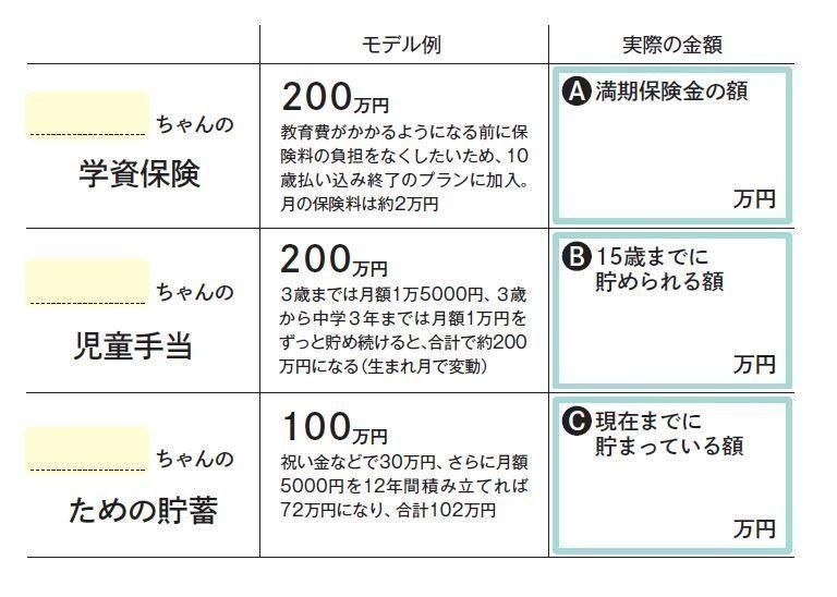 子どもが現在いくらの学資保険に入っていて、児童手当はどのくらい貯まる予定か、また子どものための貯蓄をしているなら、その金額も書き出してみましょう。