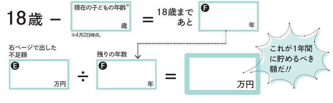 子どもが18歳になるまでに〝あと何年あるか”を計算したら、不足額(E)をその年数で割って、1年間に貯めるべき金額をはっきりさせましょう。
