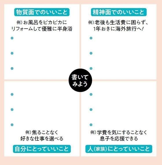 まず、貯蓄目標を、下の4項目をイメージしながら書き出そう。ポイントは「五感をフル活動」させること!心も体も震えるくらいの臨場感を持って未来を想像してみて。1000万円が人ごとではなくなり、やる気スイッチが入ります!