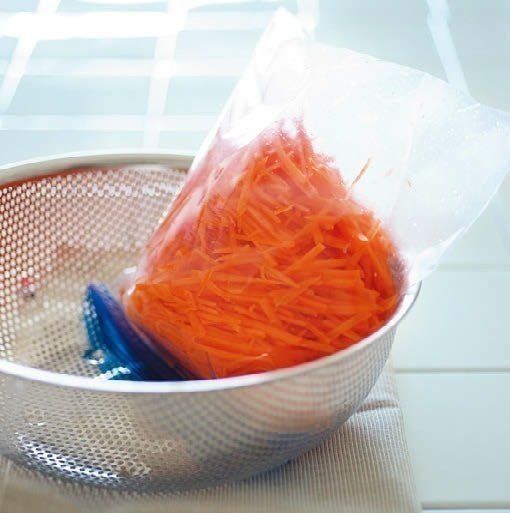 カットして洗った野菜は、ぬれたまま袋に入れ、口を少し開けて逆さにして、放ったらかしで水きりを。しっかり水きりしておくと、冷凍してもくっつきにくい!