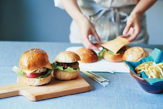 ハンバーガーも本気で作ると、高級バーガーの迫力に!「パテとバンズを手作りして本格的に。豪華な見た目にこだわるとテンションが上がり、おうちにいながらレジャー気分を楽しめます」