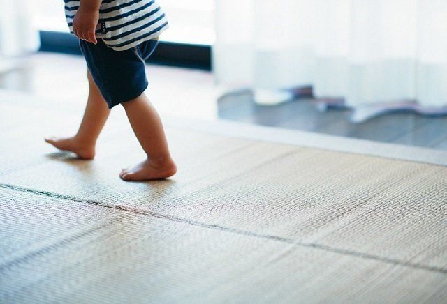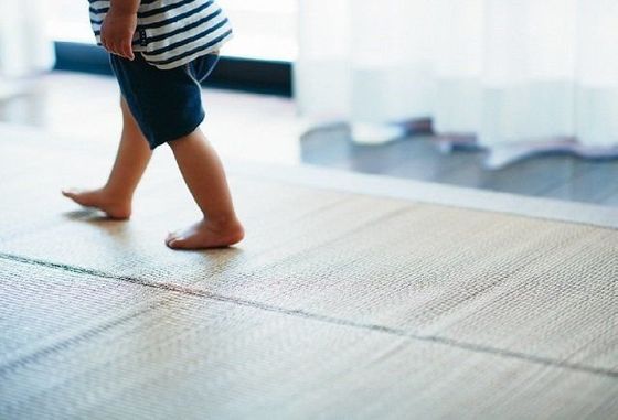 夏はリビングにござを敷き、汗で床がベタベタするのを防止。「子どもも気持ちよさそうにゴロゴロでき、いぐさの香りも清涼感いっぱい♪ ちょっとしたことですが、快適さが全然違います」