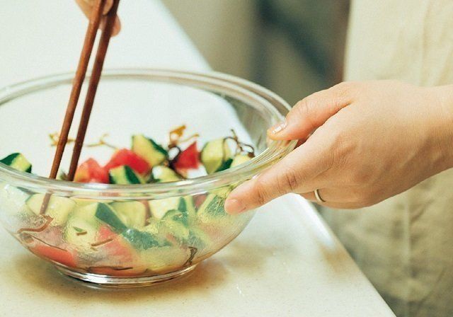 旬のきゅうりとトマトは、安くて栄養もいいから冷蔵庫に常備。「塩昆布やごま油とあえてサラダ、そうめんのトッピングなど、食卓の彩りもアップ」
