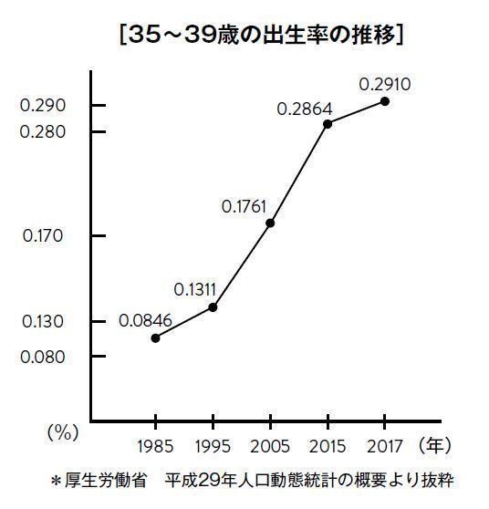 厚生労働省(17年)によると、16年に比べ、34歳以下での出生率が低下し、35~49歳の各年齢層での出生率が上昇。特に35~39歳は年々増え、30年前に比べて3.5倍に。