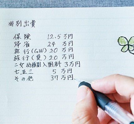 去年の家計簿を見直して、毎月の生活費以外にかかるお金を予算立て。冠婚葬祭費、帰省代、行事に必要な費用はもちろん、予想できなかった出費にも対応できる「特別出費の予備費」も確保。(田浦恭子さん〈仮名〉)