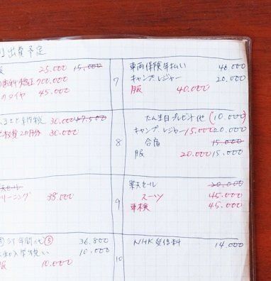 予算とのズレがあった出費は、赤字でメモして翌年の参考に。「使わなかった予算、予測できなかった出費もあり、振り返りは重要です」