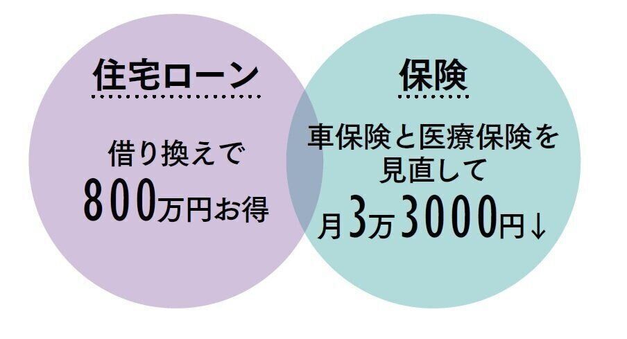 即効性があり、確実に支出を減らせる固定費の見直しに着手。住宅ローンは返済13年目に借り換えをして800万円の節約に。医療保険と自動車保険も必要最低限に変更。