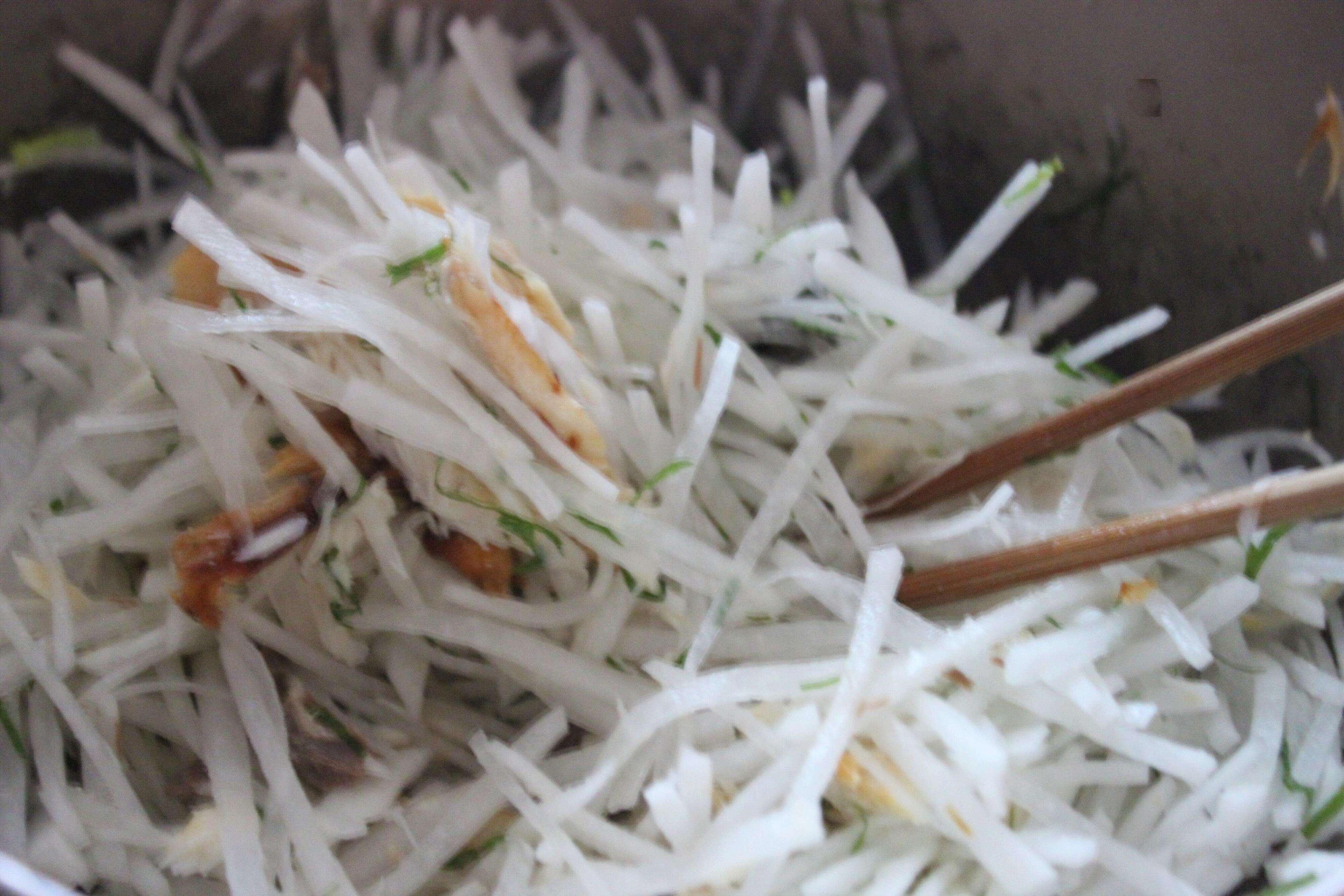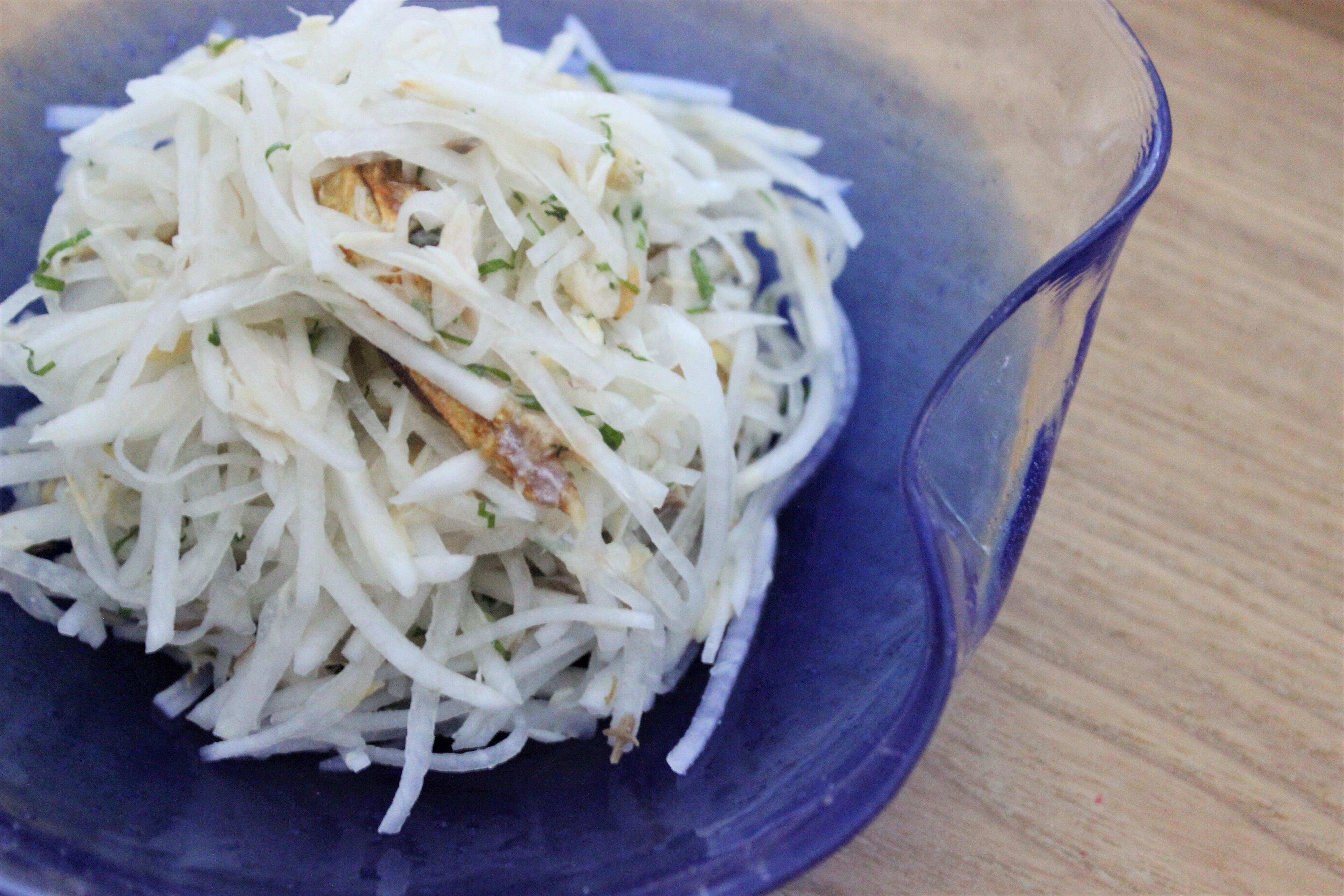 1.大根は千切りして塩もみし、水気を切る。大葉は千切りする。