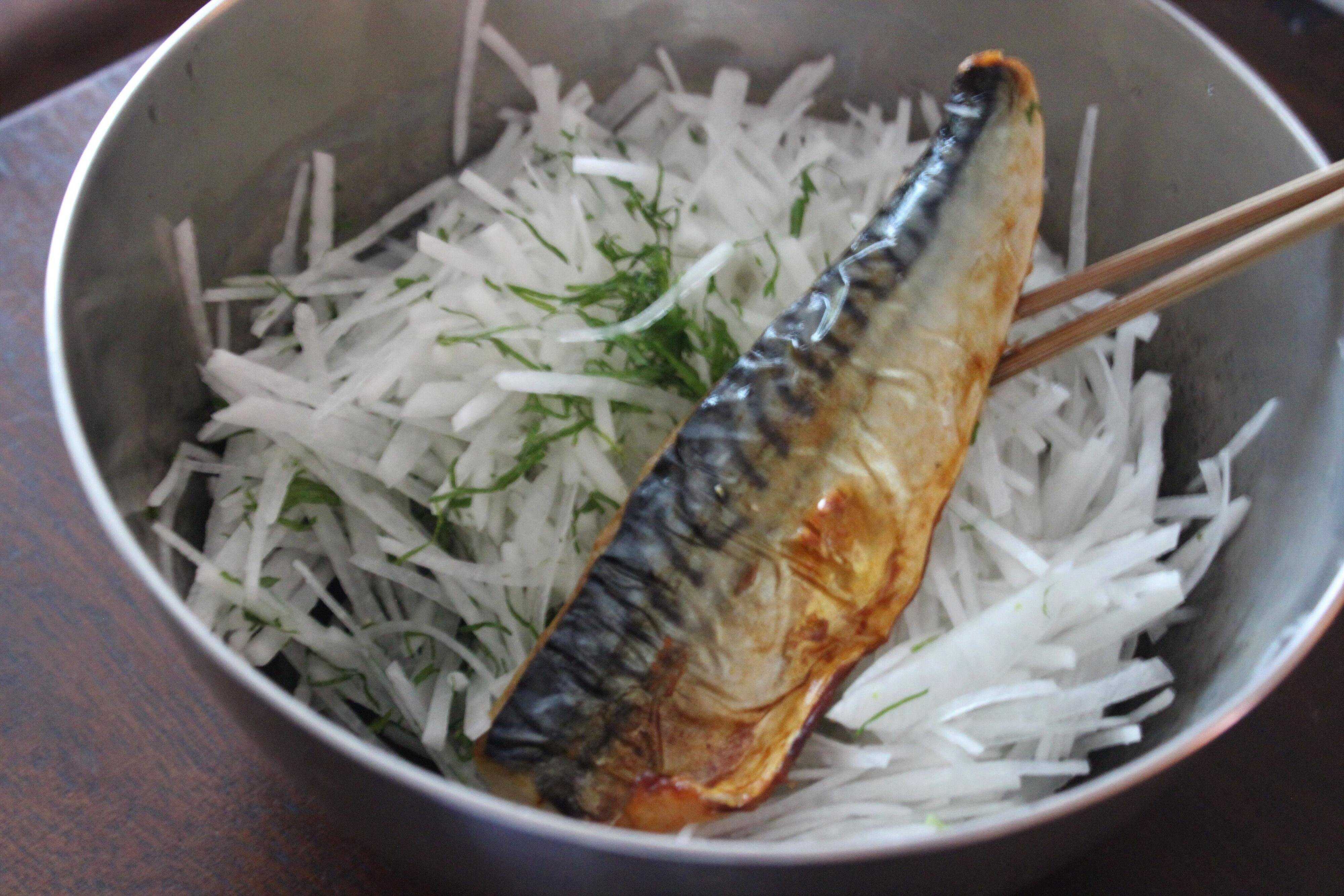 焼き魚をこんがり焼いて、大根の千切りや、玉ねぎの薄切りと和えるだけ。