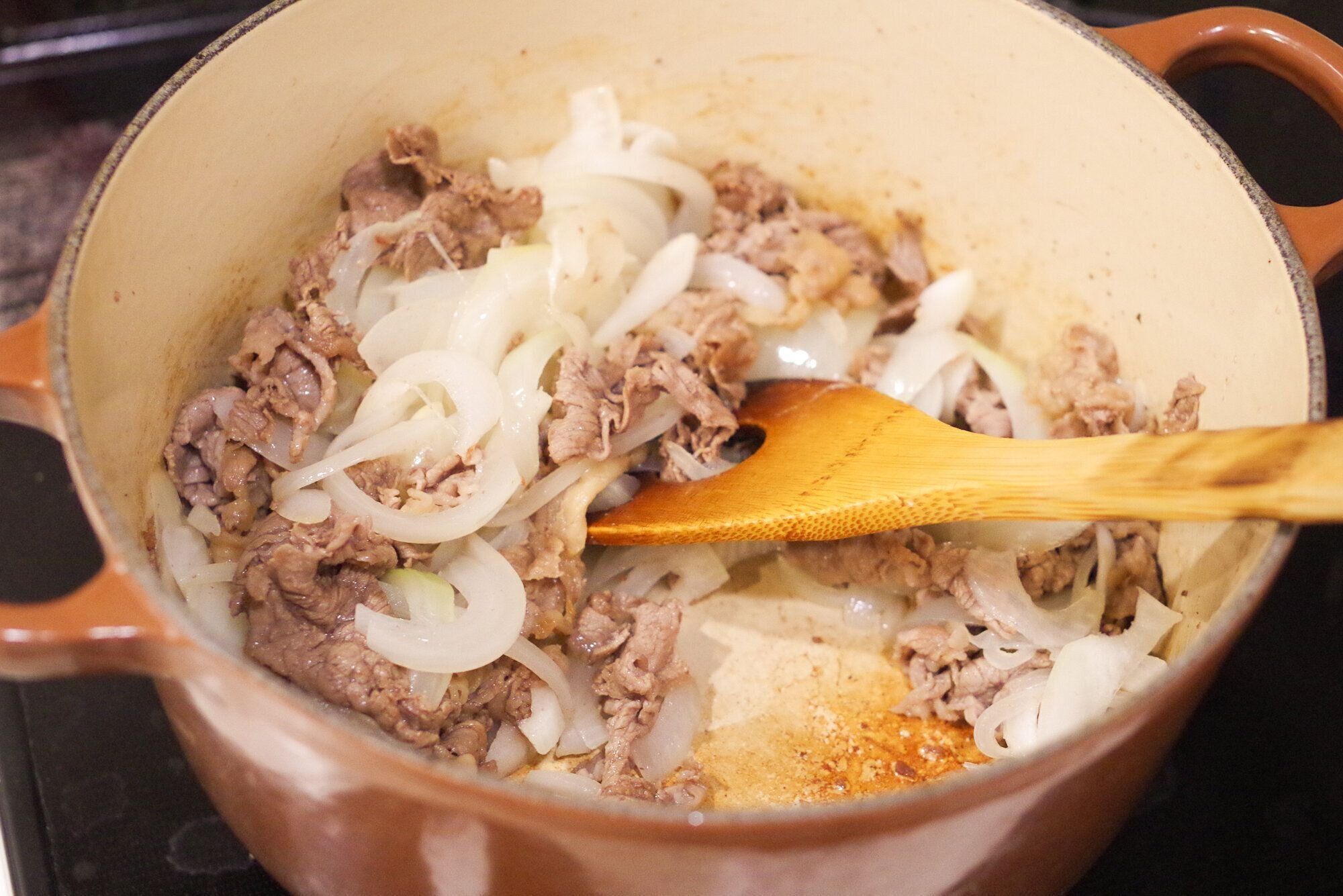 レンジでチンするのがこだわりポイント。お鍋でたくさん炒める時間も短縮できて、時短につながります。牛肉の色が変わった段階でレンチンした玉ねぎを投入!