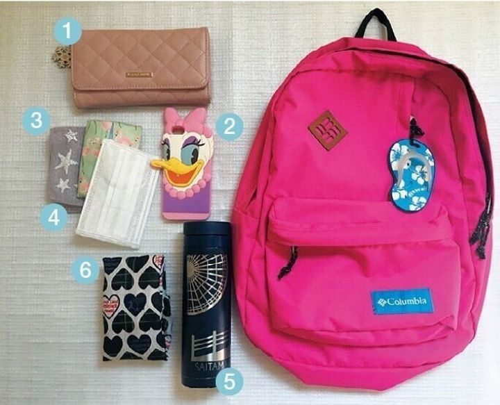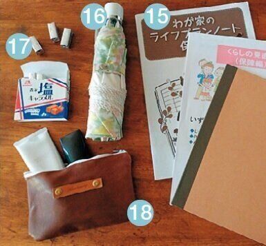 (1)薬、絆創膏など、(2)定期券、(3)ミニ財布、(4)ハンカチ、リップ、(5)スマホ、(6)自宅の鍵、(7)エコバッグ、(8)消毒液、(9)水筒、(10)ペン、(11)鏡、(12)職場の鍵、(13)ペンケース、(14)手帳、(15)ノート、勉強用資料、(16)晴雨兼用傘、(17)おやつ(キャラメルなど)(※長時間外出のときに追加)、(18)メイク道具