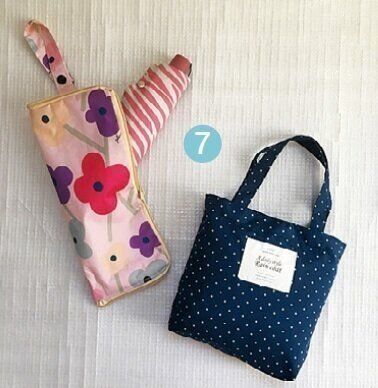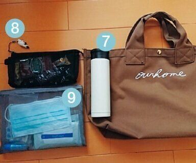 (1)長財布(買い物メモも中に)、(2)スマホ、(3)ハンカチ、ティッシュ、(4)マスク、(5)水筒、(6)エコバッグ、(7)折りたたみ傘、レインコート