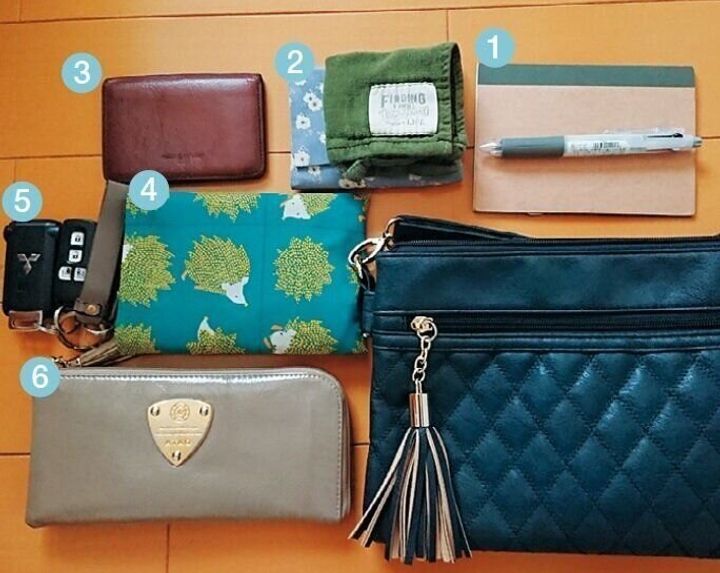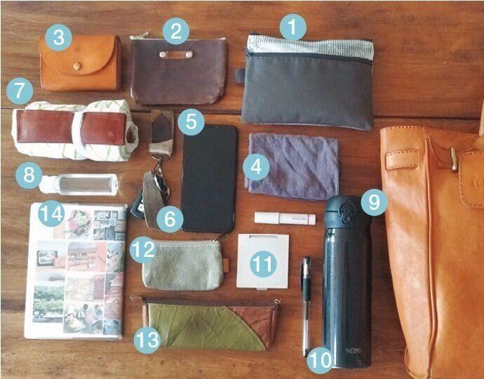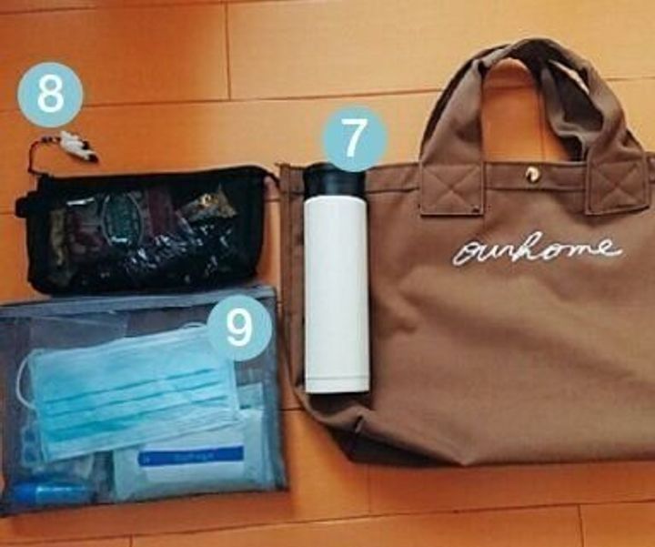 (1)ペン、メモ帳、(2)ハンカチ、ティッシュ、(3)定期券、(4)エコバッグ、(5)鍵、(6)長財布、(7)水筒、(8)おやつ(あめなど)、(9)マスク、除菌ティッシュ、目薬、薬