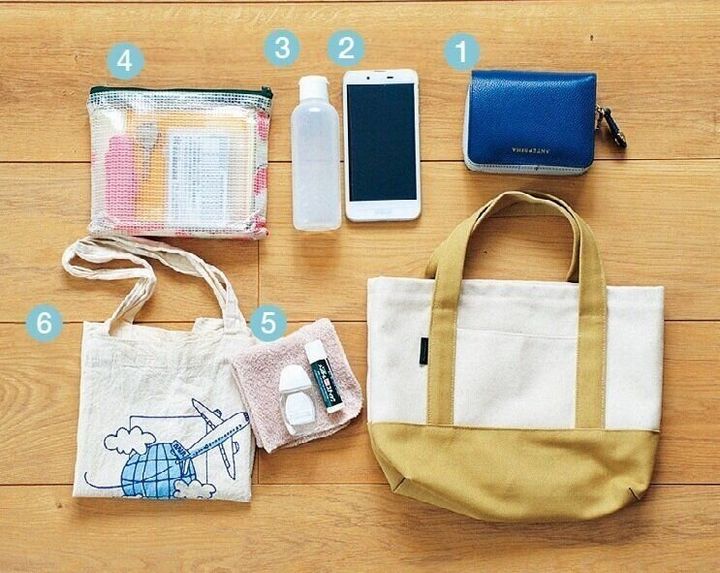 (1)二つ折り財布、(2)スマホ、(3)消毒液、(4)保険証、診察券、印鑑、(5)リップ、目薬、ハンカチ、(6)エコバッグ