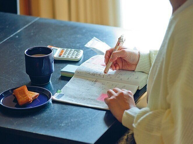 月に一度、ムダな出費はないか、いくら貯まったか、家計を見返す時間を取ります。「家事を終わらせ、コーヒーも用意してじっくり。特に貯蓄は数字を見ると達成感があり、来月も頑張ろうとやる気に」。