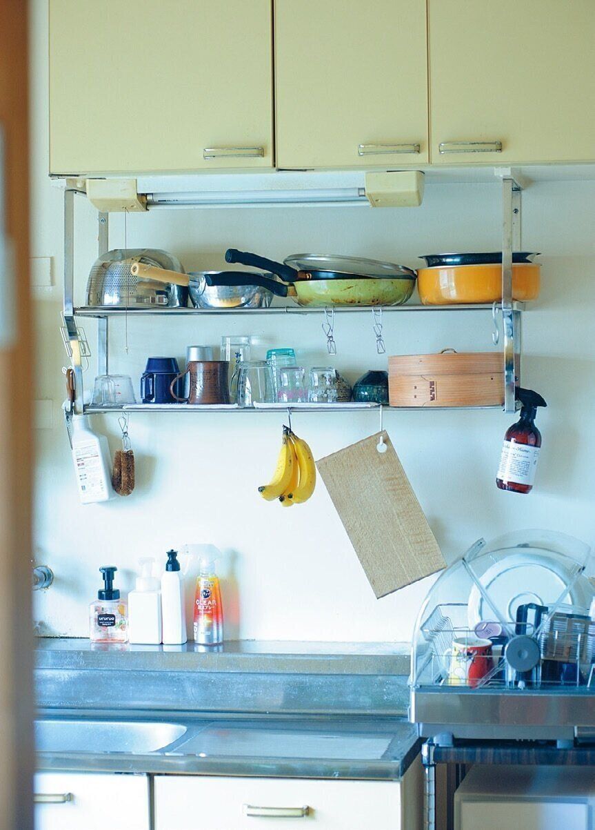 鍋やボウルはシンク上の棚に置けるだけ。食器棚も処分して、器はシンク下に入る分だけに厳選しました。「しまう場所がなければ、物をやたら増やせないので、買い物も慎重に考えるようになりました」。