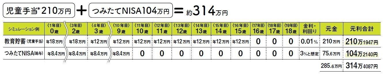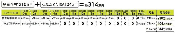 「児童手当を約200万円定期預金し、100万円はつみたてNISAを使うプラン。18歳まで長く運用できるので、平均3%と比較的リスクの低い運用でも、月7000円ずつ10年の積み立てでOK。そのまま据え置けば元金75.6万円を104万円以上に殖やせる試算です」。