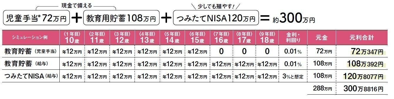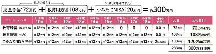 「6年分の児童手当で72万円、月収から1万円を定期預金に、もう1万円をつみたてNISAで積み立てるプラン。元金は9年間で合計288万円ですが、運用の力で12万円ほどプラスになり、300万円を達成できる計算です」。