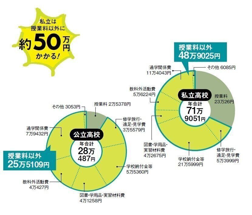 高校は公立も私立も、授業料が実質無償化。私立にも通いやすい時代になったのは事実です。「ただし、私立は授業料以外の部分が高く、年間では平均約50万円かかっています。公立も、定期代や部活動費などが必要です」。
