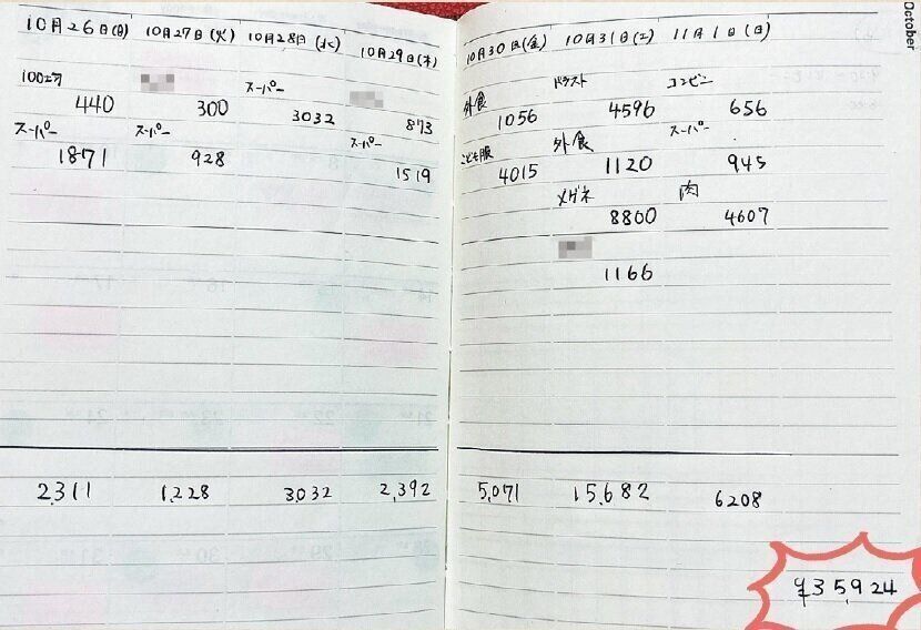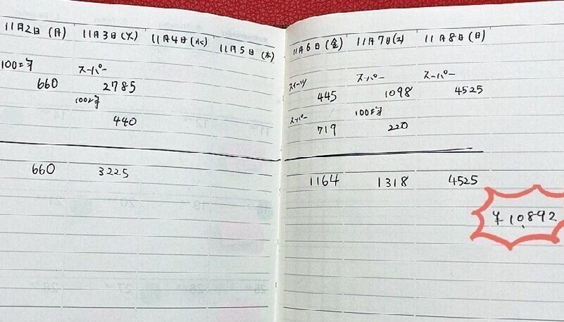手帳に1日ごとに使った金額を書き出すように。「1週間で集計してみると……こんなに使っていたなんて自分でも驚き!給料日後だったので、つい使いすぎてしまったかも」。