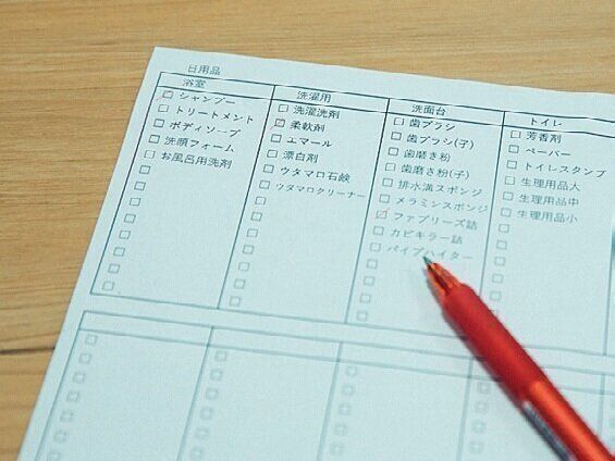 「場所別に使う日用品を書き出したリストを用意し、不足品をチェック。消せるボールペンを使えば1枚のリストを使い回せます」。
