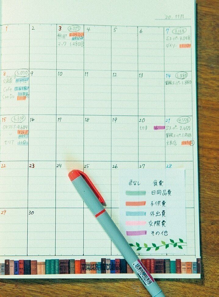 食費や日用品費など、費目はマーカーで色分け。「同じ店で食材と日用品を買ったら、金額は分けて記入」。