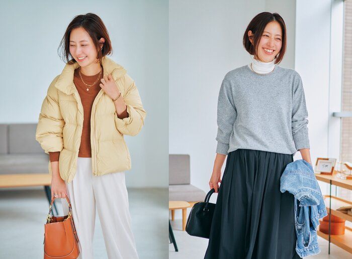 〈40代のユニクロ〉グレーのメンズのカシミヤセーター&イエローのダウンジャケット