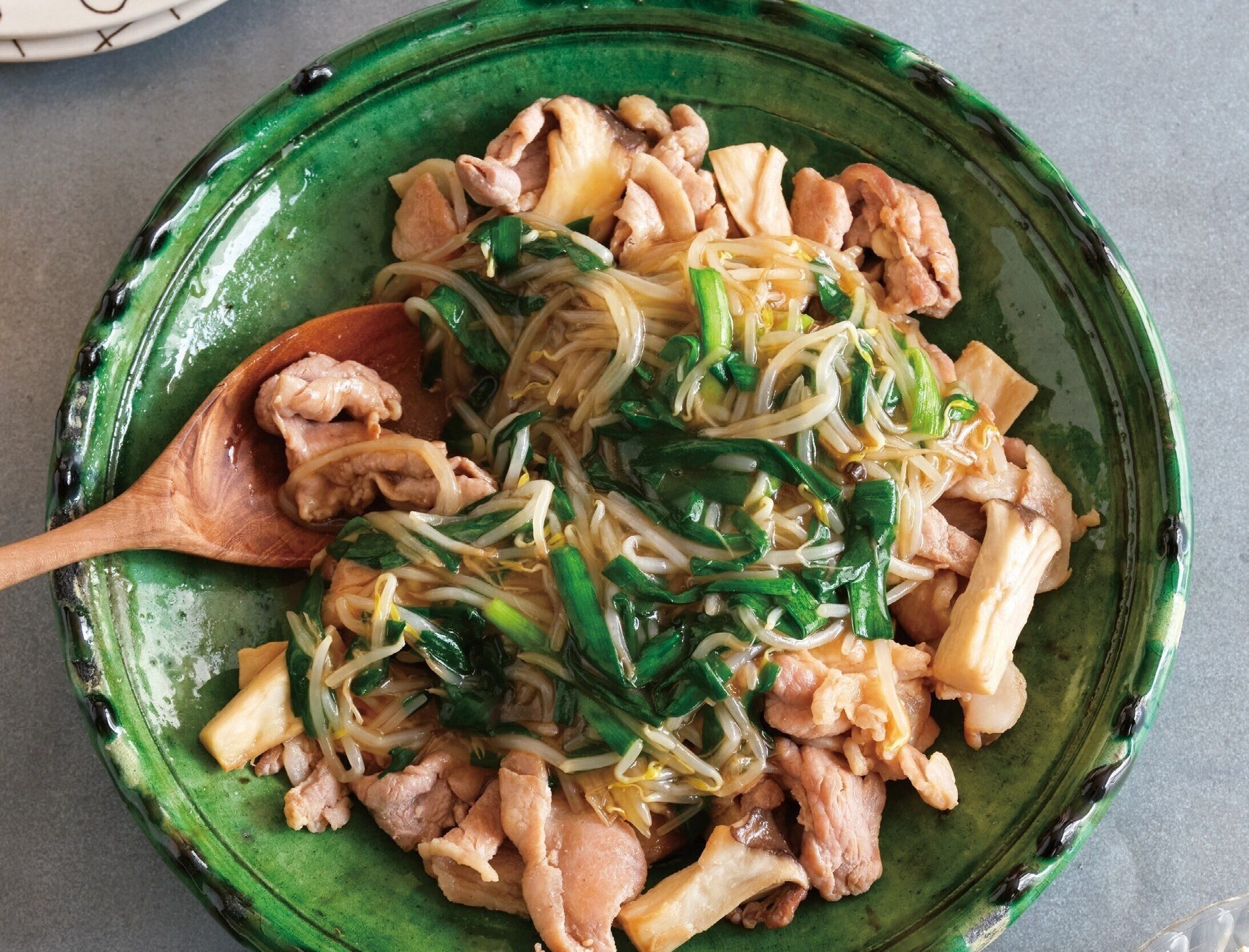 豚こまエリンギ炒めもやしにらあんかけ&くずし豆腐のオニオンスライスのせ