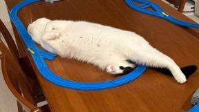 身体のまわりにプラレールが繋がれても、気にせず寝続けるマンチカン。愛猫と3歳息子の日常に「かわいいが渋滞中」の声