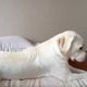 飼い主をチラ見しながらベッドに寝そべる犬、無意識にしっぽを振り何かを連打!しっぽの先にあるものとは